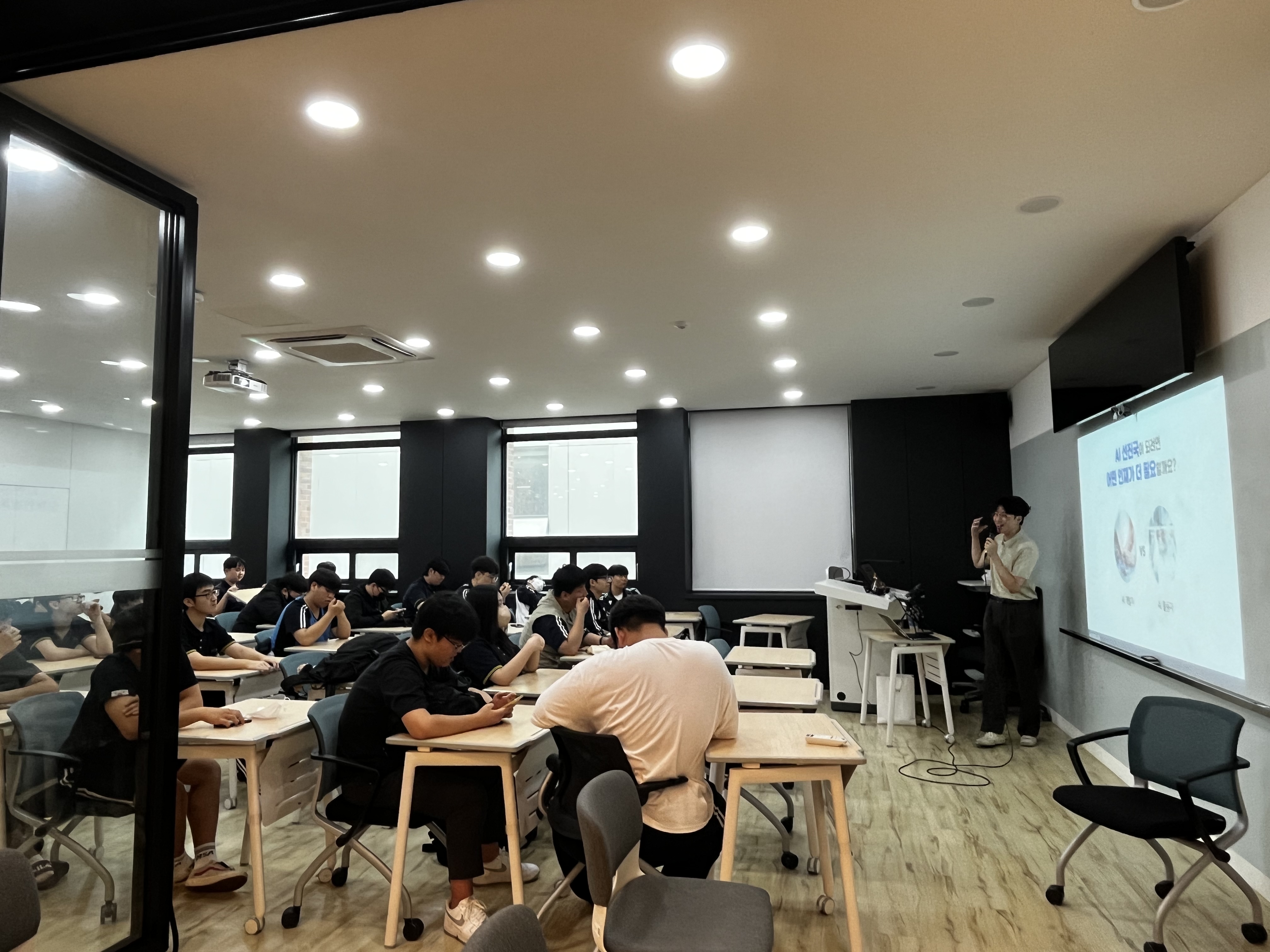 고등학교 강의는 'AI'의 정의와 AI학습 방식인 '지도학습', '강화학습', '비지도학습'의 정의를 설명해주고, 퀴즈를 내주면서 강의를 진행하는데, 오늘은 조금 다른 방식으로 진행했습니다. 기본적인 AI의 틀을 알려준 뒤 저희가 미리 학습해 놓은 자율주행 차량을 직접 체험해 볼 수 있는 과정을 진행했습니다. 이와 동시에, 수동 주행이 가능한 전기차를 배치하여 학생들로 하여금 학습된 자율주행 차량과 경주를 하여 이겨보는 체험학습을 진행했습니다.
