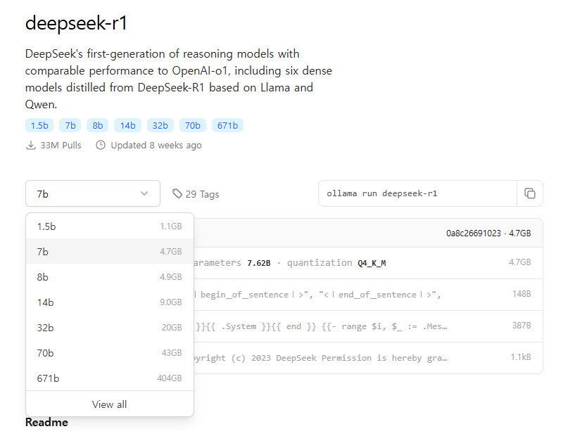 모델의 크기를 고를 수 있는 드롭다운 박스와, 오른쪽에 ollama run deepseek-r1이라고 써져 있습니다. 같은 모델 아키텍쳐라도 여러 사이즈로 나옵니다. 아주 작은 사이즈(1.1gb)부터, 큰 사이즈(404gb)까지 다양한 크기의 언어모델을 사용 할 수 있습니다. 언어모델은 모델의 크기, 즉 파라미터가 많을 수록 일반적으로 더 정확한 답변을 해줍니다. 더 다양한 상황에 대응 할 수 있게 되죠. 그런데 모델의 크기를 키우게 되면, 더 많은 메모리와 리소스를 요구하게 되고, 결국 AI 개발 비용으로 이어집니다. 또 너무 큰 모델은 일반 pc에서 실행도 불가능 합니다.