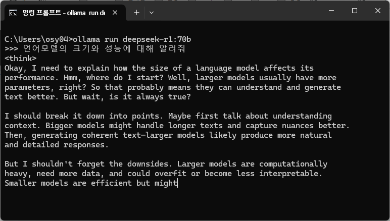 14b 모델도 작은 모델은 아니지만, 상업용 언어모델의 경우 수백기가 모델이 일반적으로 사용되고 있습니다. 비교해보면 14b 모델은 상대적으로 미니 사이즈라고 볼 수 있습니다. 그럼 70b 모델은 어떨까요? 크기가 5배 정도 되는 모델은 더 나은 답변을 해줄 수 있을 것으로 기대해 보았지만, 70b 모델도 다운받아 실행 해본 결과, 영어 또는 중국어부터 답변해줍니다. 다양한 언어에 대한 대응력이 부족한 것이 deepseek 초기버전의 한계점을 잘 보여주는 것 같습니다. (저도 나름 큰 메모리를 갖고 있다고 자부하고 있었는데 가장 큰 모델인 404gb 모델은 시도도 못해봤습니다. ㅠㅠ)