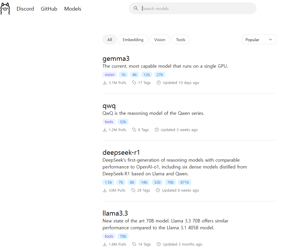 설치가 완료되면, 어떤 언어모델을 사용할지를 골라야 합니다. ollama 메인페이지에서 models를 클릭하거나 여기를 클릭하면 사용가능한 모델이 여러개가 뜹니다. 가장 위에 gemma3와 또 deepseek, llama 모델이 뜨네요. qwq모델은 알리바바에서 만든 추론 (문제풀이) 전용 모델입니다. 중국의 AI발전이 눈부십니다. 우리나라도 빨리 이렇게 발전했으면 하는 바람이 있네요.