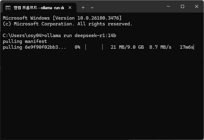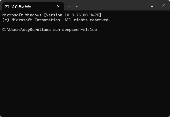 ollama는 언어모델을 실행하기 위한 플랫폼이고, 이 ollama에서 언어모델을 사용하기 위해서는 언어 모델을 따로 다운받아야 합니다. 여기서는 deepseek 모델중에서 14b 모델을 다운받아 보겠습니다. 여러분은 다른 모델도 나중에 함께 받아서 사용해 보세요.