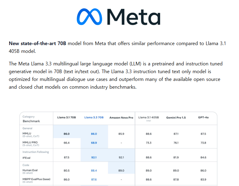 생각보다 실망스러운 한국어 성능의 deepseek-r1의 모델을 뒤로하고, 그렇다면 meta의 llama 모델은 어떨까요? 이 모델도 한 번 받아서 확인해보겠습니다. meta의 llama3.3 70b모델의 경우 모델이 여러 언어에 특화되어있다고 합니다. 반면, 참고로 70b 모델은 40기가 정도 되는 모델입니다. 위에 표에서도 보여주는데, 놀랍게도 이런 40gb 짜리 모델이 GPT-4o에 필적하는 벤치마크 성능을 보여준다고 설명하고 있습니다. 이 모델도 다운받아서 한 번 해보도록 하겠습니다. 모델 링크는 여기서 확인해 보면 됩니다.