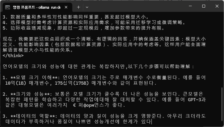 <deepseek r1 14b 모델 답변, 중국어와 한국어가 번갈아가면서 쓰이지만, 내용적인 측면에서는 얼추 맞는 답변을 해준다.>