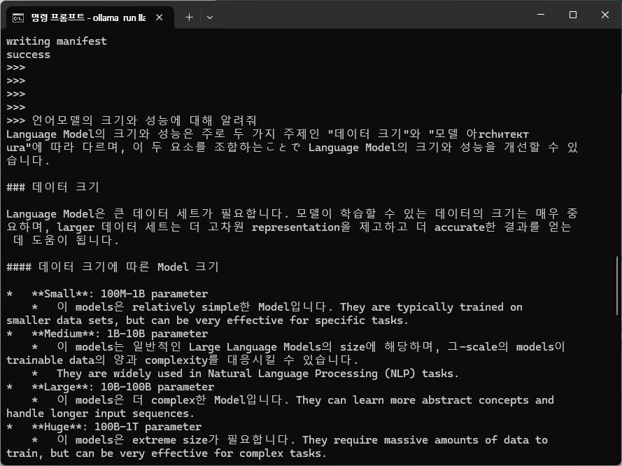 설치는 cmd에 "ollama run llama3.2:3b"를 입력하면 됩니다.