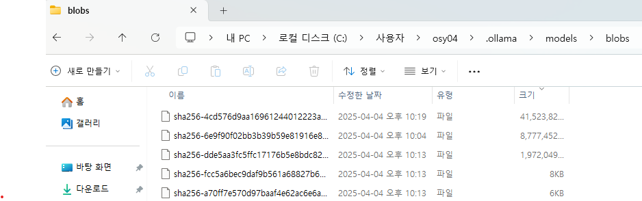 입니다. 용량이 부족해서 모델 삭제가 필요할 경우 여기서 blobs 폴더를 삭제해주면 됩니다.