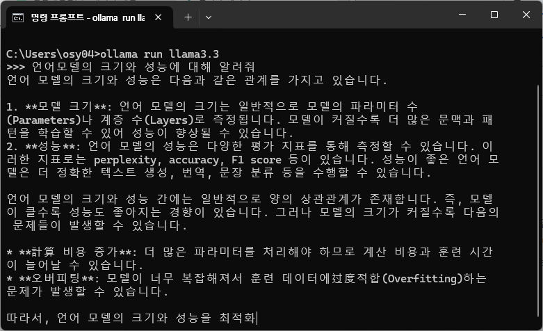 llama 3.3의 경우 한국어 질문에 대해 한국어로 답변도 해주고, 답변 자체도 퀄리티 있는 답변이 나옵니다. "모델이 커질수록 더 많은 문맥과 패턴을 학습할 수 있어 성능이 향상될 수 있음" 답변과 모델이 커졌을 때의 문제점을 잘 설명하는 것으로 나타납니다. 중간중간에 "계산 비용" 대신 "計算 비용"을 사용하지만, 한국어 답변이 우수한 것으로 보입니다. 전반적으로 모델 성능이 meta에서 설명한대로 여러 언어에 대한 대응이 잘 되는 것으로 보이는데, deepseek r1 보다 더 나은 결과로 보여집니다.